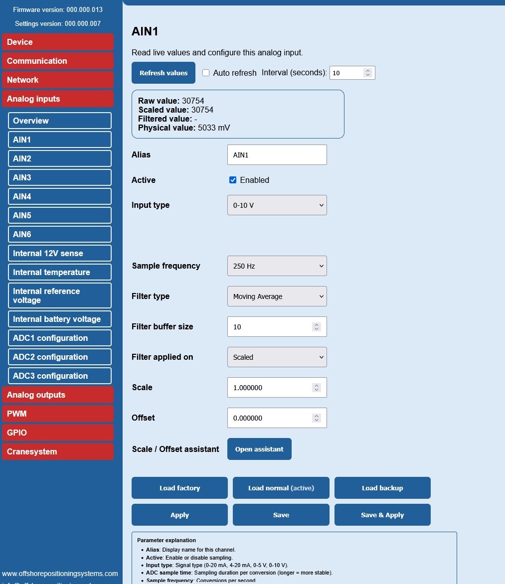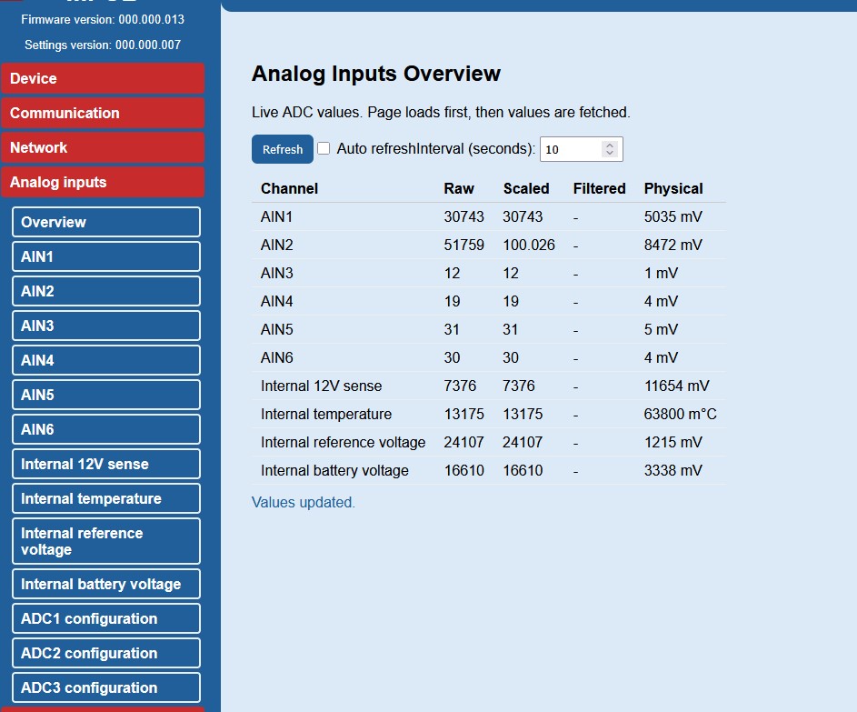Configure ADC input type 0-10V / 4-20mA ; sample frequency ; filter settings (kalman / moving average / median ...) ; scale and offset
